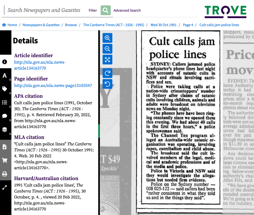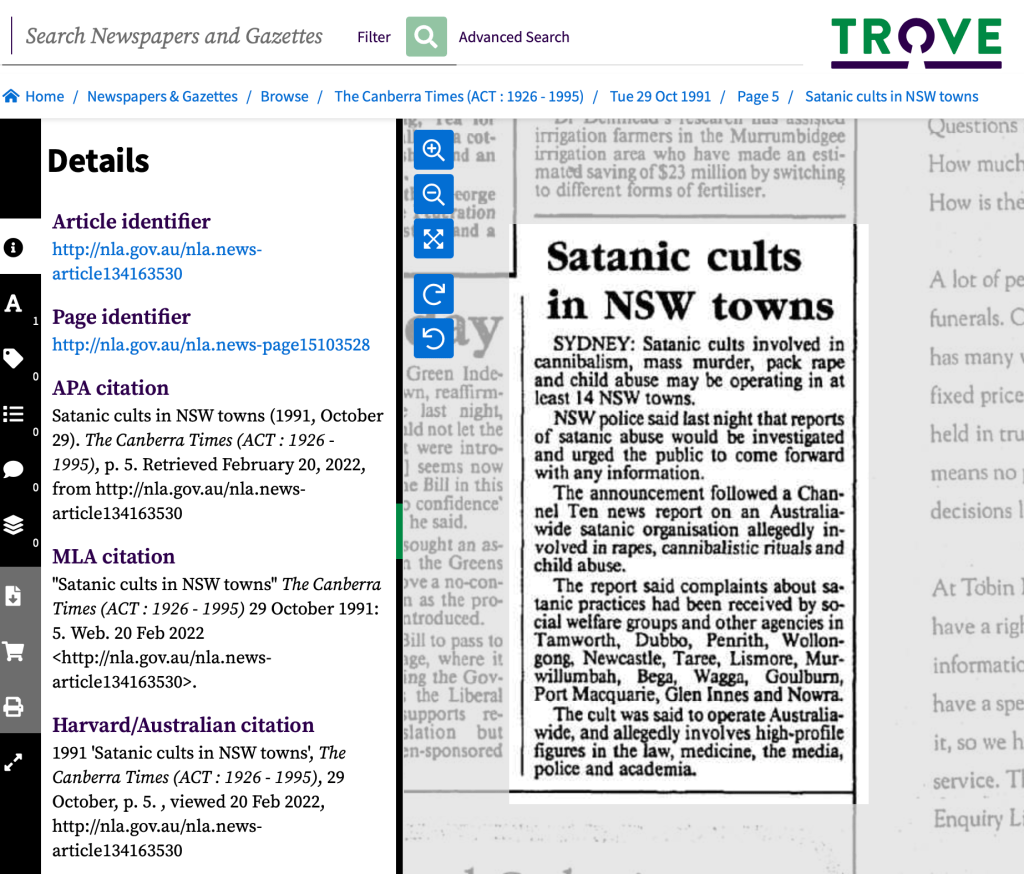 Here are two 1991 Canberra Times newspaper articles that documented the national cannibalistic, child raping, murderous cult involving the pillars of Australian society including police, doctors, lawyers, journalists, and university lecturers – just as I asserted in my free book EYES WIDE OPEN.