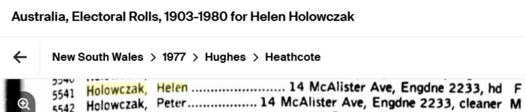 - This is the electoral roll record stating Helen and Peter Holowczak lived at 14 McAlister Ave Engadine in 1977.